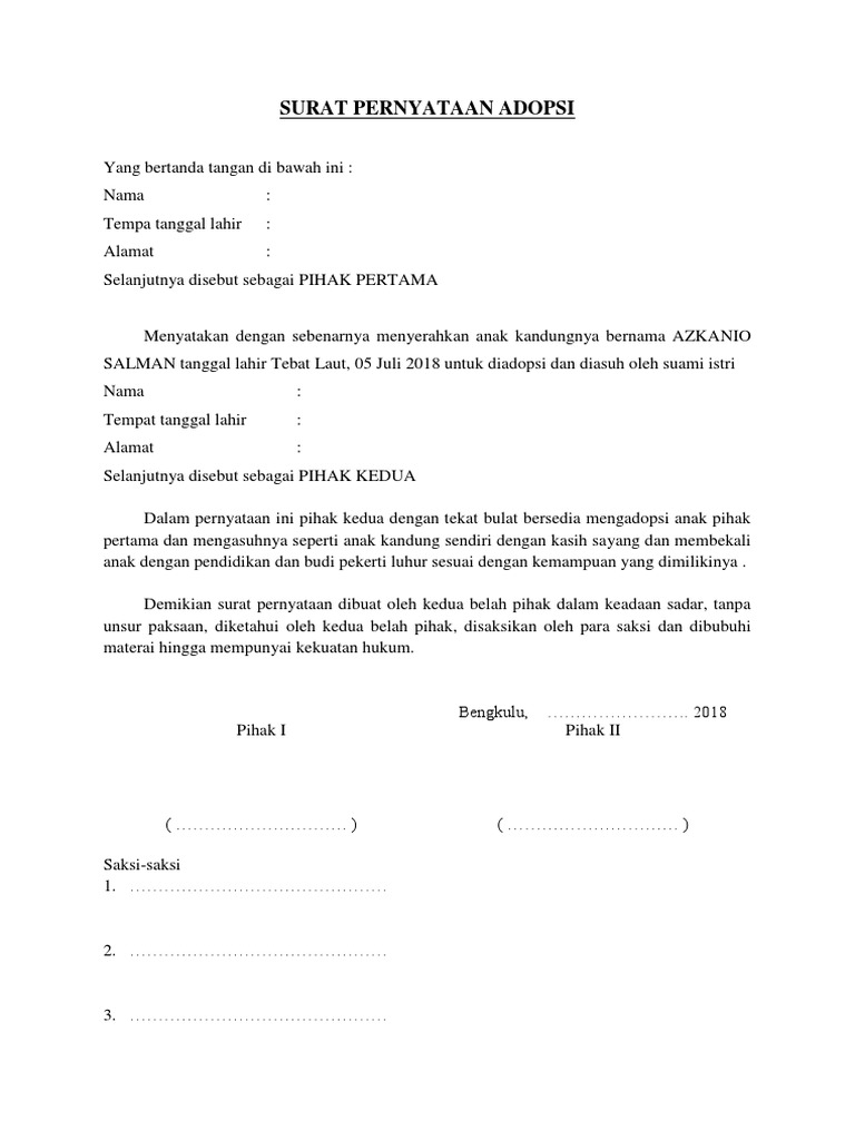 Ahmad rosyidi dan kusnari wati dengan ditanda tangani surat perjanjian ini, maka aku berhak & wajib mendapatkan tuntutan apapun dari pasangan suami istri tersebut (pihak ii). Surat perjanjian adopsi anaksurat ini biasanya dibuat ketika ada anak yang akan di pelihara oleh orang lain atau pihak orang tua angkat dan atas dasar. Berbeda dengan perjanjian yang dibuat secara tertulis, dimana sudah jelas tertulis mengenai peran dan tanggung jawab dari kedua dan dari hasil pernikahan sebelum bercerai, kedua belah pihak memiliki anak bernama andra damian fahlevi yang lahir pada 17 mei 2017. Surat pernyataan penyerahan anak doc. Dan salah satu surat perjanjian yang ada adalah surat perjanjian adopsi anak.